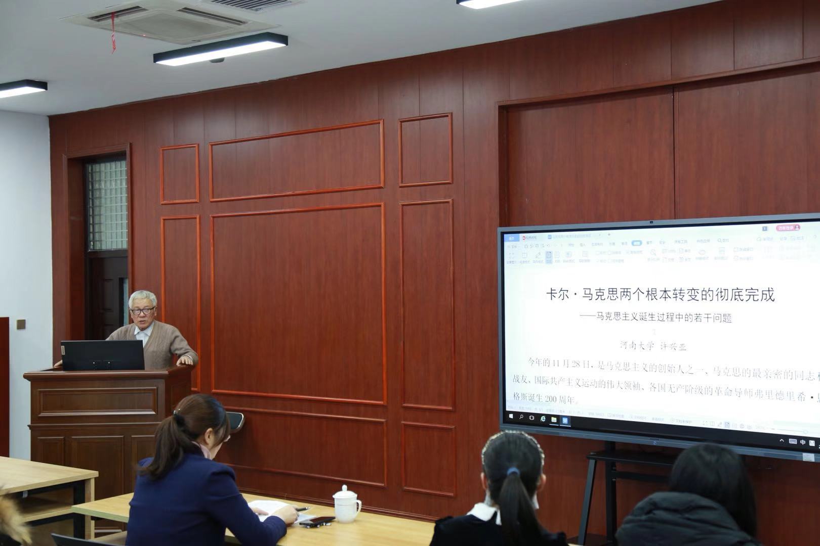 2020年11月30日,华体会·体育(中国)官方网站 在逸夫楼2403会议室举行关于“卡尔·马克思‘两个根本转变’的彻底完成”的报告会,我院特邀河南大学特聘教授,博士生导师,许兴亚教授作为此次报告会的主讲人。出席此次会议的成员有华体会·体育(中国)官方网站 副院长张立畅副教授、王晓策老师、梁策老师、张爽老师、李圆老师以及2020级、2019级、2018级部分研究生。此次报告会由张立畅副院长主持。