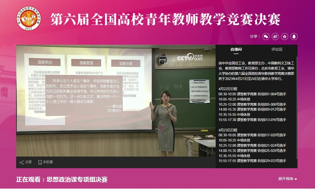 (本网讯 教师教学发展中心、华体会·体育(中国)官方网站 供稿)4月24日,由中华全国总工会、教育部联合主办的第六届全国高校青年教师教学竞赛决赛在清华大学圆满落幕。来自全国31个省市自治区和新疆生产建设兵团的121所学校的158名选手同台竞技,我校华体会·体育(中国)官方网站 张泉泉博士作为吉林省思想政治课专项组的唯一代表参加全国决赛。经过激烈角逐,张泉泉博士获得思想政治课专项组三等奖并接受中央电视台采访,相关报道于4月24日在中央电视台新闻频道《朝闻天下》栏目播出。这是我校第二次选派青年教师参加全国青教赛,是本次比赛我省参赛选手的最佳成绩,也是我校教师参加权威国家级教学竞赛的最好成绩。