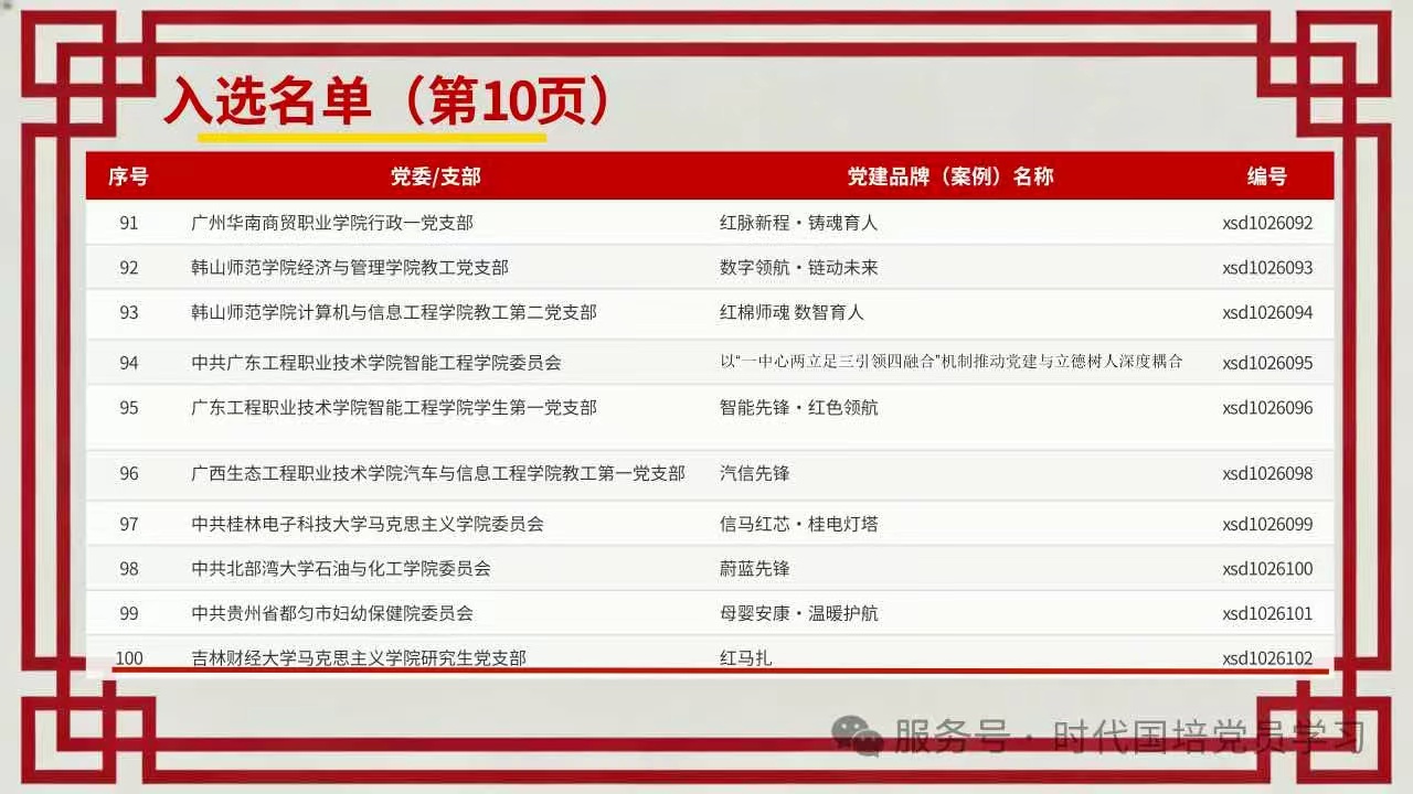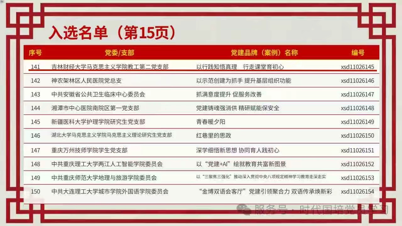 首届新时代优秀基层党建品牌案例遴选工作自2025年5月启动以来,共收到全国4325个单位报送的20432个基层党建品牌案例。经组织专家按照政治首位、党业融合、创新实用、客观公正、实效导向的原则严格评审,最终遴选出170个基层优秀党建品牌案例,我院研究生党支部和教工第二党支部申报的党建品牌案例成功入选。