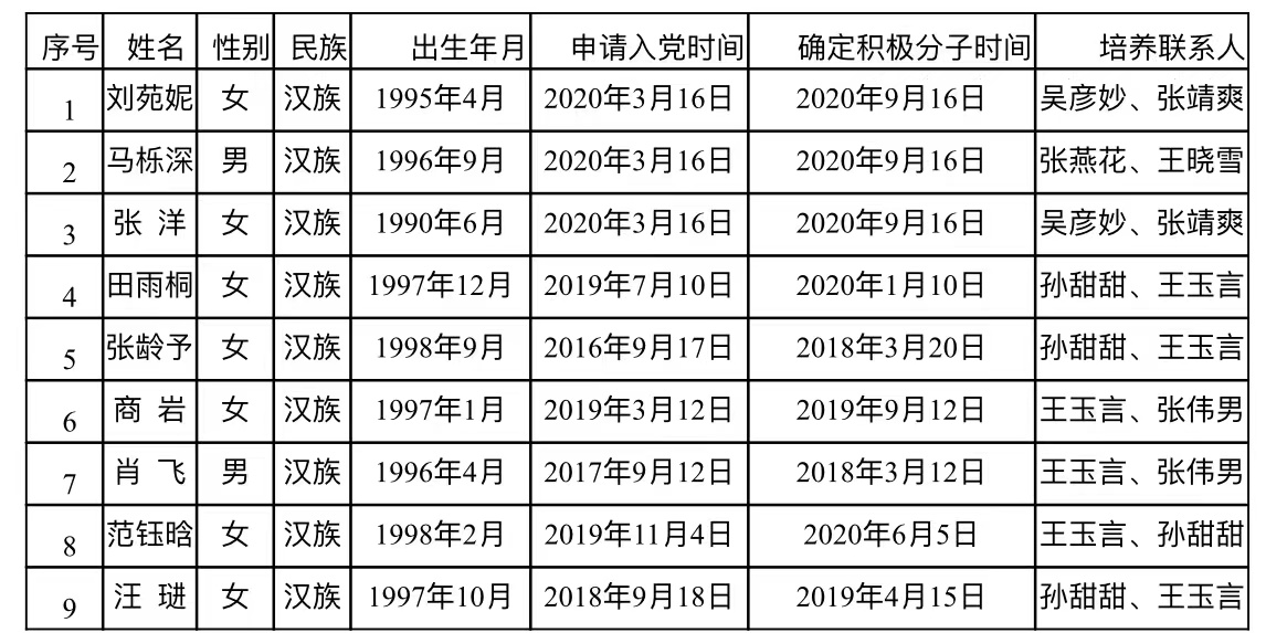 经支部委员会研究,报上级党委备案同意,将刘苑妮等9名同志列为发展对象。根据发展党员工作有关要求,现将有关情况公示如下: