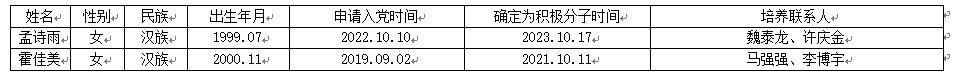 经党支部培养教育和考察,以上2名同志已基本具备党员条件,在听取党小组、培养联系人、党员和群众意见的基础上,经支部委员会2024年11月5日讨论同意并报上级党委备案,孟诗雨同志、霍佳美同志于2024年11月5日被列为发展对象。