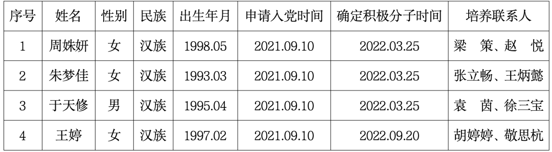 经支部委员会研究,报上级党委备案同意,将周姝妍等4名同志列为发展对象。根据发展党员工作有关要求,现将有关情况公示如下: