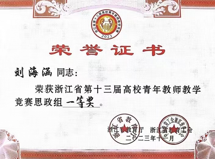 从教五年,曾荣获浙江省第十三届高校青年教师教学竞赛一等奖、浙江省高职高专院校思想政治理论课教师教学技能大赛一等奖、浙江省高校思政微课大赛三等奖、台州市教育系统青年教师理论宣讲大赛二等奖等十余项奖项。在浙江省教育厅等主办的“你眼中的最美‘窗口’”大型理论宣讲活动中作直播宣讲,课程于“中国蓝新闻”APP全程直播,播放量突破115万,《浙江新闻联播》专门进行报道。主持市厅级课题2项、校级课题3项,参与省部级等各类课题多项,多篇论文在省、市各类征文中获奖,入选台州市“三台新秀”社科优秀青年,获台州市优秀青年理论宣讲员、优秀班主任等荣誉称号。